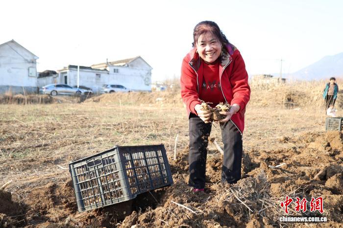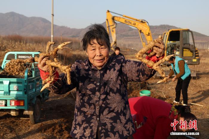 11月26日,山东省泰安市岱岳区天仄街讲耿庄村,村平易近们正在田间劳碌采支泰山黄粗,1株株充分的黄粗破土而出。周艺伟 摄