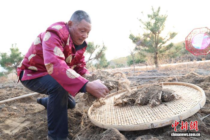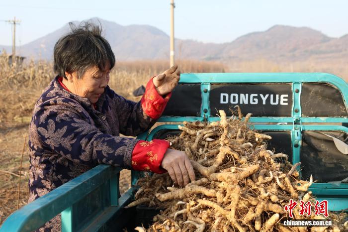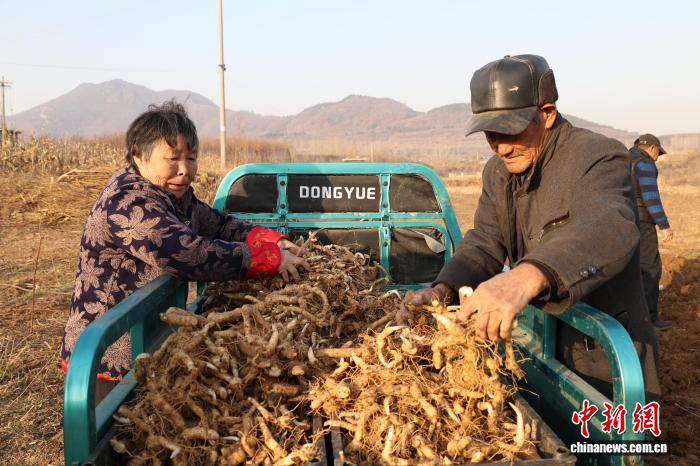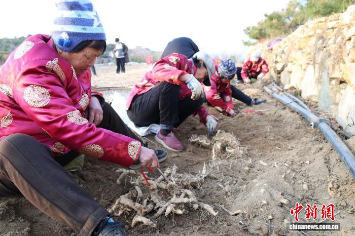11月26日,山东省泰安市岱岳区天仄街路耿庄村,村平易近们正在田间劳碌采支泰山黄粗,1株株充沛的黄粗破土而出。周艺伟 摄